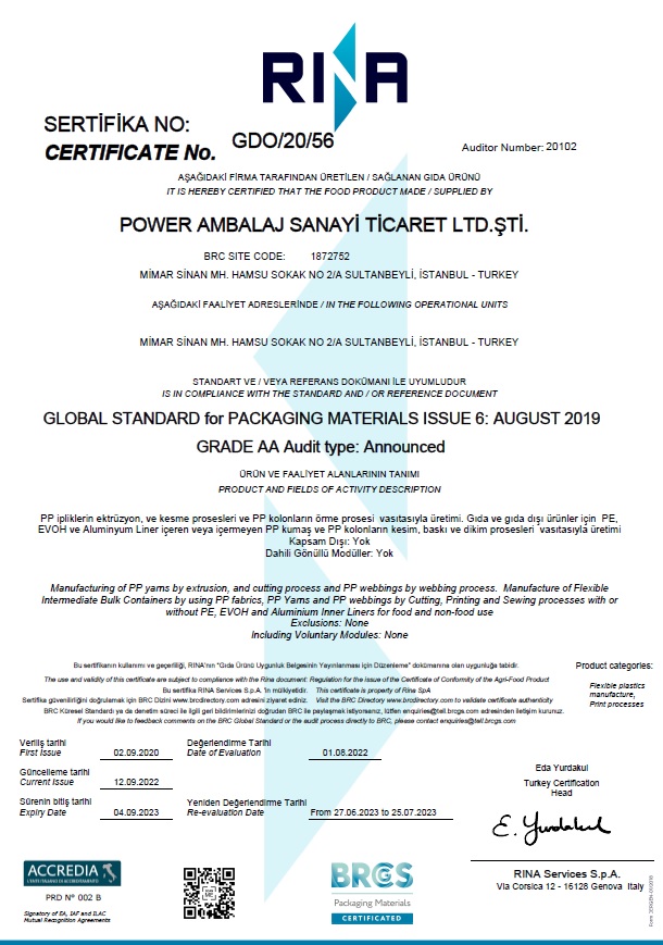 Power Ambalaj olarak; müşterilerimizin bigbag ihtiyaçlarını ISO 9001 Kalite ve ISO 22000 Ürün Güvenliği Yönetiminin gereklilikleri doğrultusunda en iyi şekilde karşılamayı, kalite ve ürün güvenliğini tanımlanmış ve ölçülebilir kalite kriterlerine uygun olarak sürekli geliştirmeyi, “herkes kendi yaptığı işin kalitesinden sorumludur” anlayışıyla müşteri memnuniyetini her koşulda en üst seviyede tutmayı taahhüt ediyoruz.